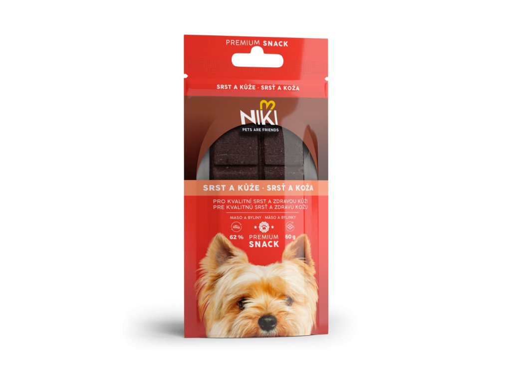 Premium snack Niki je monoproteinový, chutný a vyvážený pamlsek pro psy. Vedle vysokého podílu masa, vyváženého složení a prémiové chuti zlepšuje kvalitu srsti a pomáhá udržet zdravou pokožku. Biotin se podílí na zlepšení kvality kůže, srsti a drápků. Při nedostatku biotinu se srst stává matnou, lomivou a drsnou. Pokožka je přesušená, svědivá a s tvorbou lupů. Drápky jsou při nedostatku lomivé a třepivé. Biotin je vhodný doplněk také pro březí a kojící feny. Trvalé podávání biotinu usnadňuje rozčesávání a zabraňuje plstnatění srsti. Lososový olej je bohatým zdrojem Omega 3, 6 nenasycených mastných kyselin a dalších hodnotných látek. Při pravidelném používání významně zlepšíte kvalitu srsti. Bylinný komplex zlepšuje kvalitu srsti a pokožky.