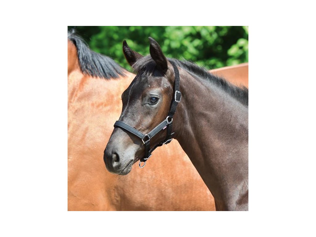 Nastavitelná hříběcí ohlávka na nose, týlu i u podhrdelníku. Lícnice a nánosník ze syntetické kůže.